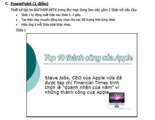 • Thực hành: Yêu cầu soạn thảo văn bản (Word), thiết lập bảng tính và công thức (Excel), tạo bài trình chiếu (Powerpoint).